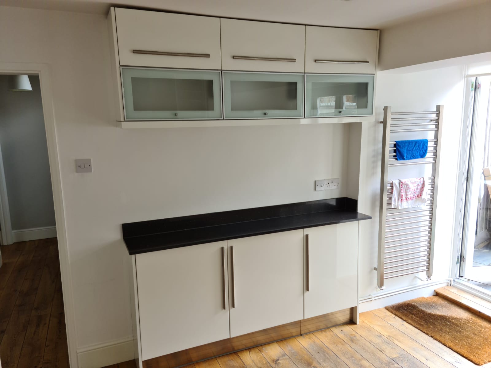 Dove grey kitchen with wood worktops maintenance man.